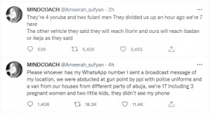 She tweeted, “Please whoever has my WhatsApp number I sent a broadcast message of my location.