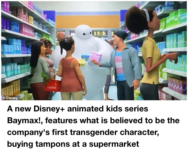 A new Disney+ animated kids series Baymax!, features what is believed to be the company’s first transgender character, buying tampons at a supermarket.