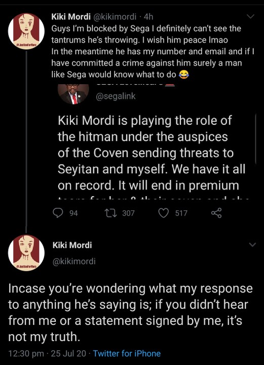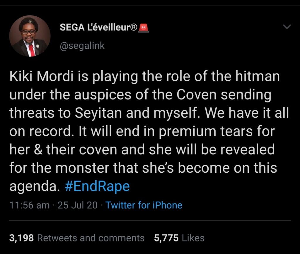 “Kiki Mordi is playing the role of the hitman under the auspices of the Coven sending threats to Seyitan and myself. We have it all on record,” he wrote.