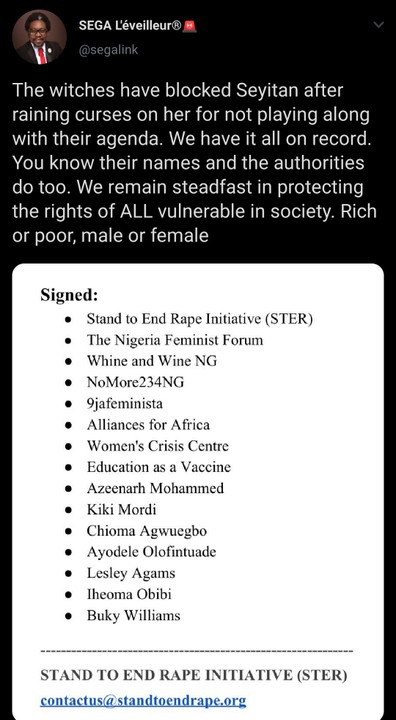 “It will end in premium tears for her & their coven and she will be revealed for the monster that she’s become on this agenda. #EndRape,” Mr Awosanya tweeted.