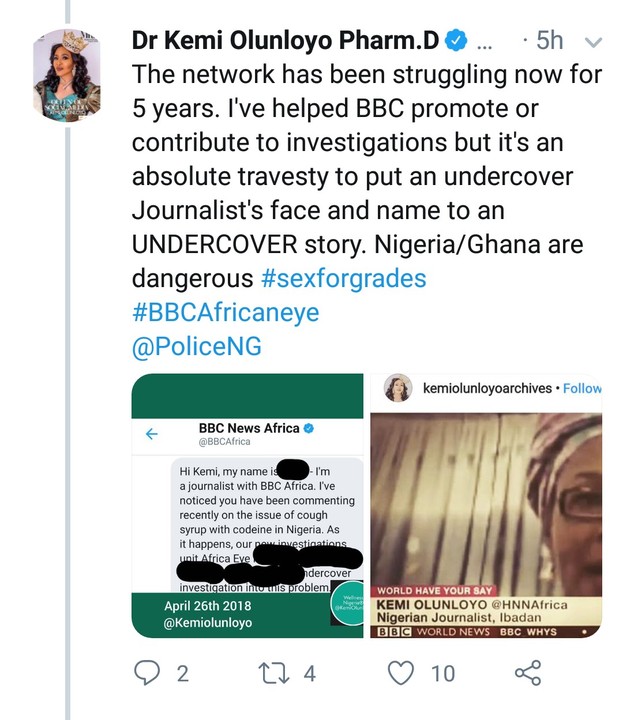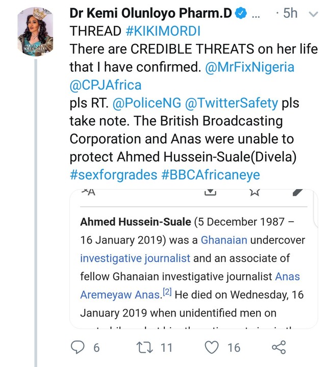 According to Kemi Olunloyo who tweeted in reaction to news of death threats on Kiki Mordi, the identity of the reporter should have been protected.