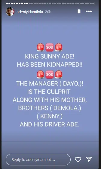Damilola Esther Adeniyi-Adegeye, the daughter of the music icon, took to her social media page to raise the alarm as she wagged the finger of accusation at his manager and stepbrother, Dayo Adegeye.