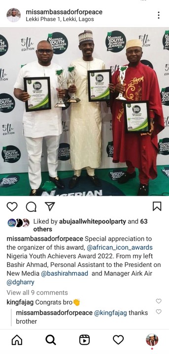 At Nigeria Youth Achievers Award which took place in Lagos recently, the Personal Assistant to President Muhammadu Buhari on New Media, Bashir Ahmad was also honoured with award of Youth Icon of the Year