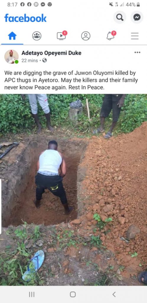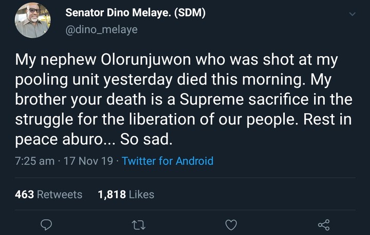 Mr Olorunjuwon, nephew to Senator Dino Melaye who was shot yesterday at Ayetoro ward 1 unit 4, Dino’s polling unit by political thugs has been confirmed dead this morning by the Senator’s family.
