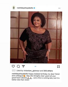 It’s women supporting women as the wife of kogi state Governor , Mrs Rashida Bello took to her Instagram handle to send a heart warming birthday message from Saudi Arabia to her junior colleague, the wife of the Deputy Governor, Mrs Ejura Onoja As she turn 35 years.
