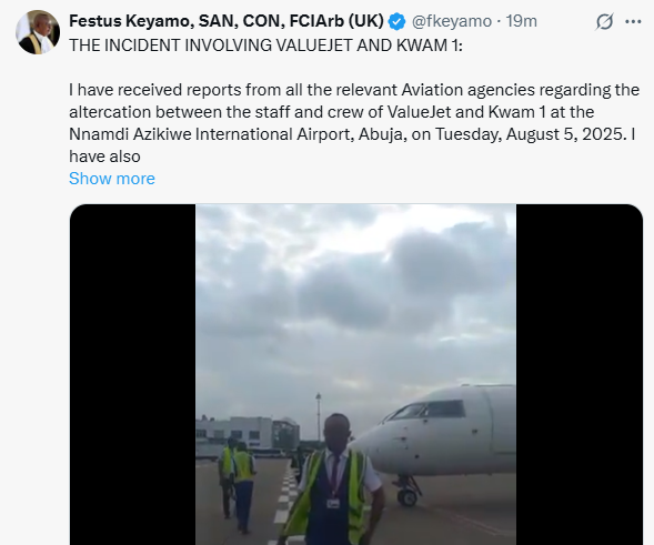 I have received reports from all the relevant Aviation agencies regarding the altercation between the staff and crew of ValueJet and Kwam 1 at the Nnamdi Azikiwe International Airport, Abuja, on Tuesday, August 5, 2025. I have also received video footages of the incident.