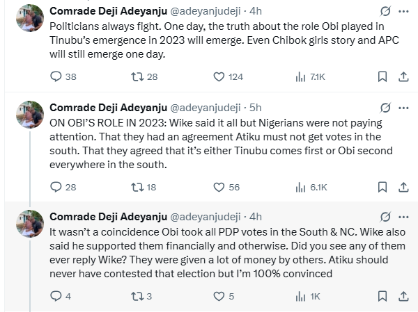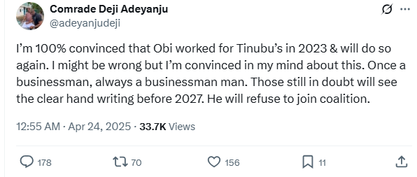 “I’m 100% convinced that Obi worked for Tinubu in 2023 and will do so again. I might be wrong, but I’m convinced in my mind about this,” Adeyanju stated.
