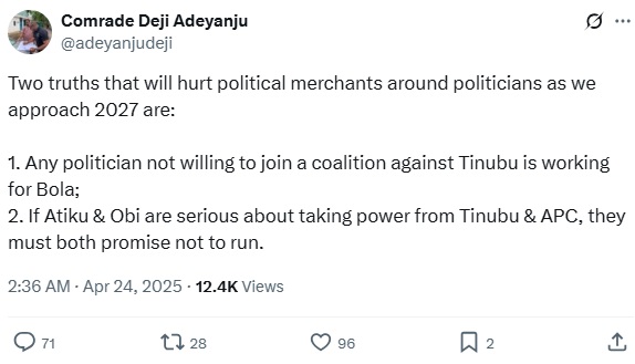 Sharing his views in a series of posts on his X (formerly Twitter) account, Adeyanju addressed the prospects of a united opposition coalition ahead of the 2027 elections, led by former Vice President Atiku Abubakar. He argued that for such a coalition to succeed, politicians like Atiku and Obi must step aside and allow a neutral candidate to emerge.