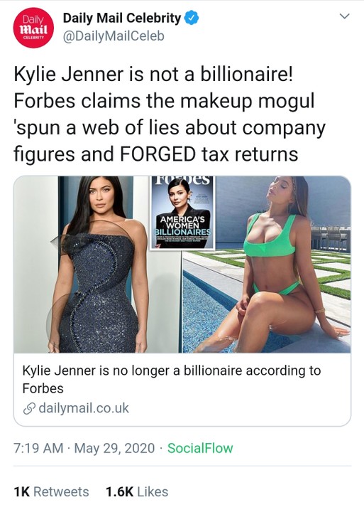 Forbes now pegs Kylie’s net worth at $900 million. In a statement on Twitter, she fired back, writing: ‘what am i even waking up to. i thought this was a reputable site.. all i see are a number of inaccurate statements and unproven assumptions lol.’