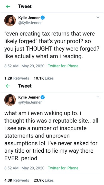 Kylie bashed the most explosive claim in the report, that she and her publicists had shown journalists tax returns that were likely forged in order to support inflated claims of her net worth.