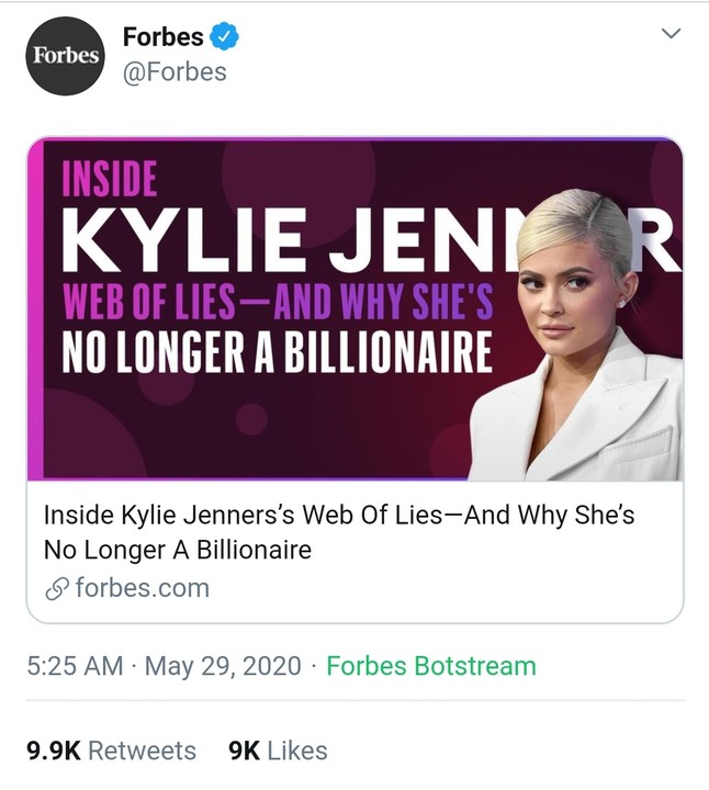 Forbes itself put Kylie on the cover in March 2019, hailing her as the youngest ever self-made billionaire.