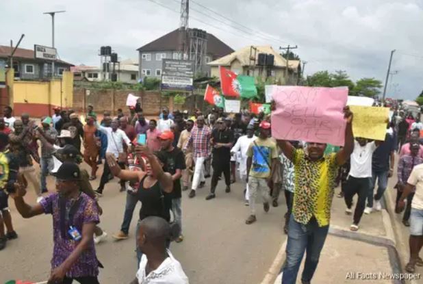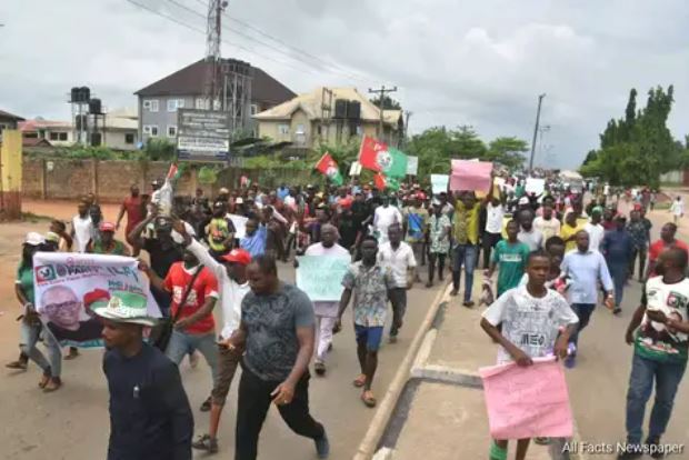 The stated the protest at the INEC office in Abia on Tuesday, asking the commission to declare Alex Otti as the winner of the governorship election in the state.