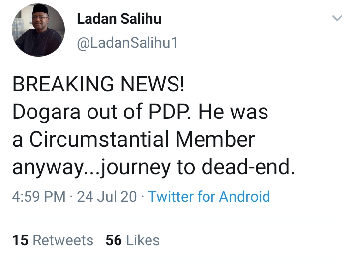 Dogara out of PDP. He was a Circumstantial Member anyway…journey to dead-end.