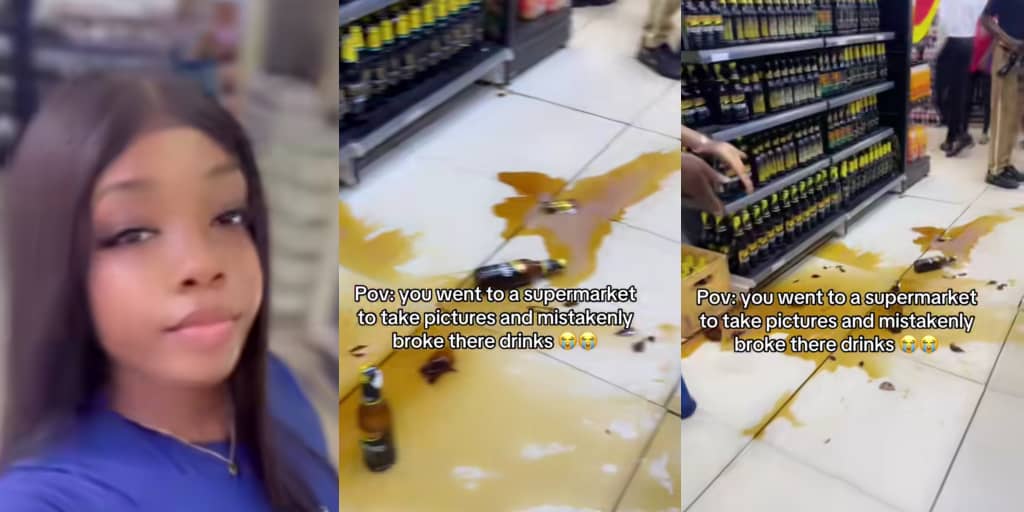 A Nigerian lady has gone viral after accidentally breaking several bottles of drinks while visiting a supermarket just to take pictures.