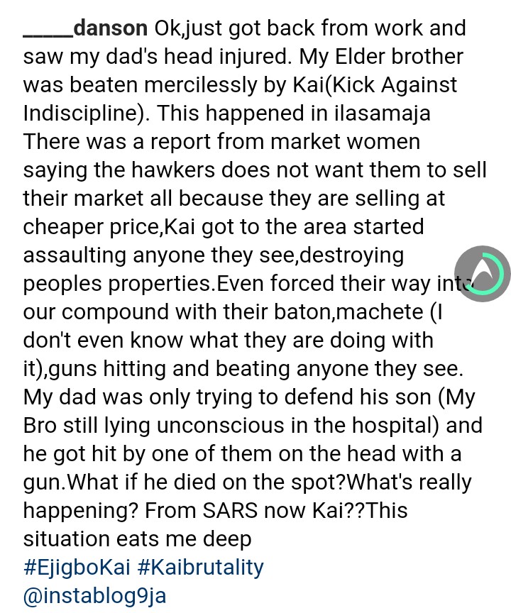 Ok,just got back from work and saw my dad’s head injured. My Elder brother was beaten mercilessly by Kai(Kick Against Indiscipline). This happened in ilasamaja