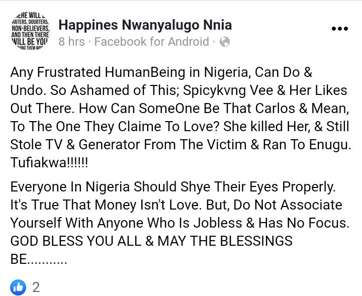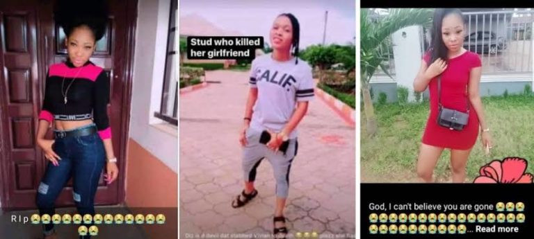 The deceased, identified as Vivian, allegedly caught her lesbian partner Spicykvng Vee having s3x with a man.