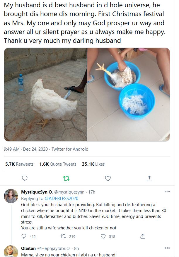 A Nigerian lady who took to twitter to appreciate her husband for buying her a live Chicken for their first Christmas together has come under intense fire from twitter users who felt the Husband should have killed and defeathered the chicken instead of making her go through the stress of doing it herself. However a lot of others took her side and defended her.