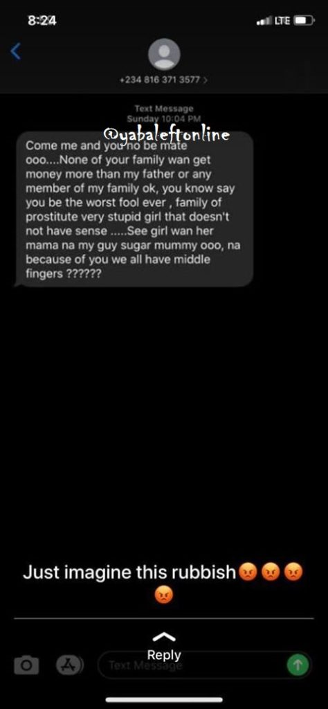 “Come me and you no be mate ooo.. None of your family wan get money more than my father or any member of my family. Ok, you know say you be the worst fool ever, family of prostitute. Very stupid girl that doesn’t have sense. See girl wan her mama na my guy sugar mummy ooo, na because of you we all have middle fingers”.