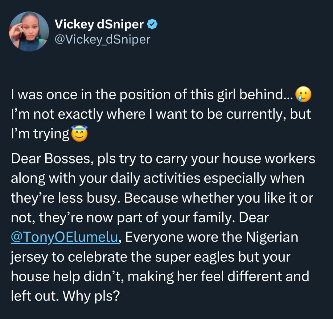 Directing her message to Tony Elumelu, she highlighted the family’s collective celebration in Nigerian jerseys but questioned the exclusion of the housemaid, deeming it unfair and questioning the message it conveyed.
