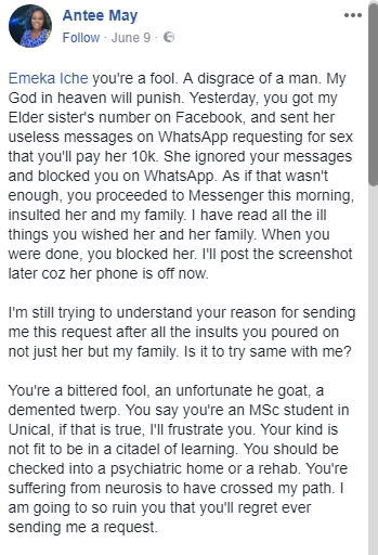 Antee May in her post said she has made it her job to frustrate the guy Emeka Iche, for looking down on her sister so low that he could price her 10k, I won’t even try to waste your time, just read her bomb below!