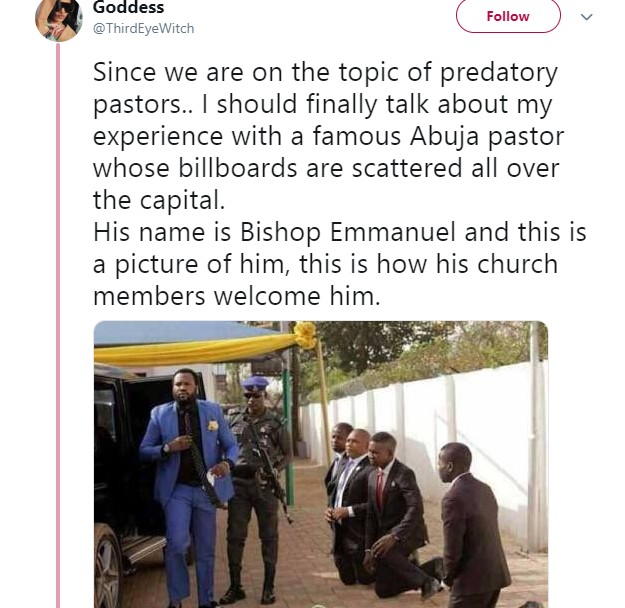 Just after Timi Dakolo called out COZA’s Pastor Fatoyinbo over an alleged sexual abuse of members in different cities across the world, another lady has called out an Abuja Pastor, Bishop Emmanuel Esezobor of Firehouse Church in Abuja for demanding sex from her.