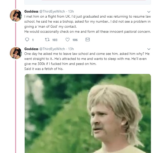 The lady who called out Bishop Emmanuel Esezobor, disclosed that they met while on a flight from the UK. She further revealed that he promised to give her 300K if she has sex with him and pees on him. She further revealed that she blocked him after he moved on to her friends, following her refusal.