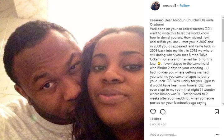 Well done on your so called success ��. I want to write this to let the world know how in denial you are, How wicked , evil and selfish you are . I met you in 2007 and in 2008 you disappeared, and came back in 2009 back into my life .. in 2012 we where still dating when you met Bimbo Taiye Coker in Ghana and married her 6months later �, I even stayed in the same hotel with Bimbo 2 days to your wedding .. ( I had no idea you where getting married) you told me you came to lagos to burry your uncle ��. Well luckily for you …(guess it would have been your funeral ��) you even slept in my room that night ( I wonder where Bimbo was�) . Fast forward to 2 weeks after your wedding , when someone posted on your facebook page saying congratulations on your wedding to Bimbo �, Shock of life. I called your phone and behold it was Bimbo Coker Oladunni that picked the call. As a Mumu that I have been since 2007 I believed you when you told me she was the same girl you told me Obasanjo wanted you to marry. Not until I met Dee and was checking her iPad and saw your wedding pictures ��♀️ . By den your marriage was crumbling and you lied again to me that she used juju �…I believed oh and still continued with this so called love relationship after your breakup with Bimbo , We stayed together in lagos you lied that Bimbo made you broke , we spent all my money and even stole my sisters money for you �… I left work and moved to Ghana , we stayed at your friends house for like 1 month before getting our own apartment, I thought I was going to finally start life with the man I truly loved , forsaking all the things you’ve done in the past. I started school in Ghana ( which you paid for only 1 semester that caused the whole fight) and we lived happily till after 4months when your DISAPPEARING MADNESS started again ��♀️.