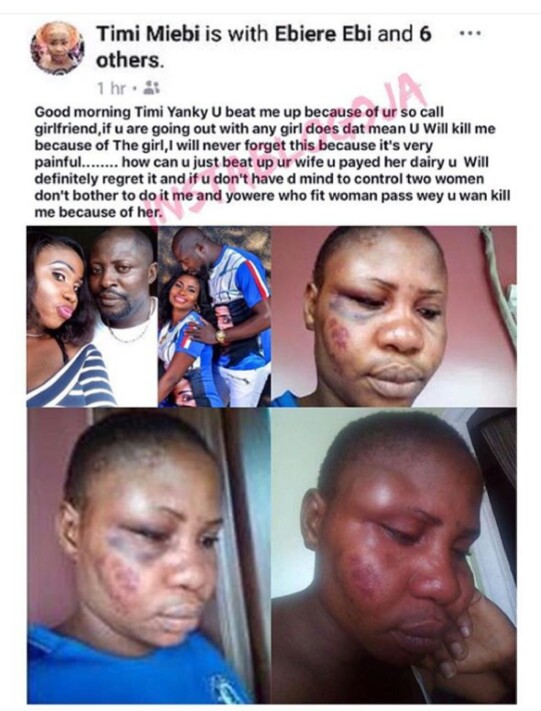 Nigerian lady with name, Timi Miebi has taken to social media to call out her husband, Timi Yanky after beating her mercilessly because of his side chic.