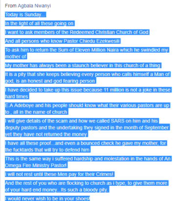A Nigerian Lawyer and Facebook user, Agbala Nwanyi called out RCCG Pastor whose name she gave as Pastor Chiedu Ezekwesili, for swindling her mum of #11million.