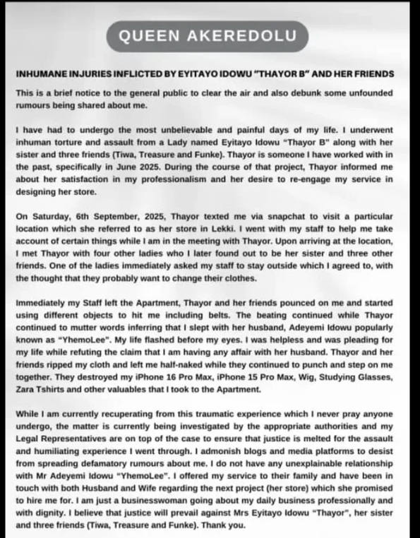 In a statement shared online, Queen alleged that Thayor B and her friends lured her to an apartment in Lekki under the guise of a business meeting and then assaulted her.