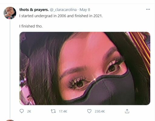 According to the lady identified as Clara Carolina, she gained admission into the university in 2006 and recently graduated in 2021, after fifteen years.