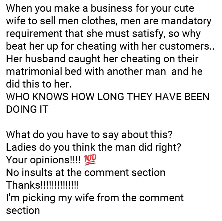 According to eyewitness, lady cheated on her husband after her husband open a men boutique for her, the husband caught his wife with another man on their matrimonial bed then the man beat the woman up.
