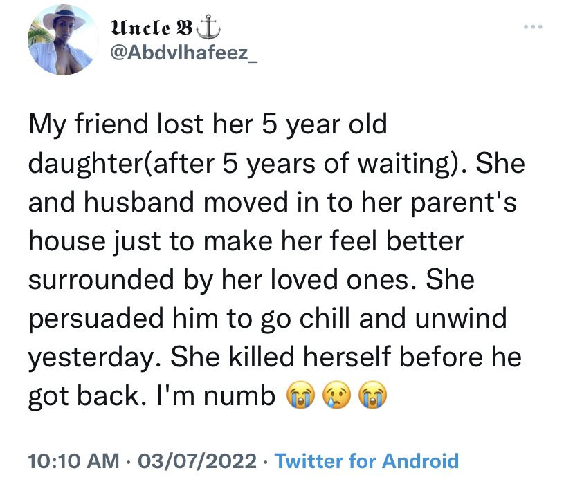 According to her friend @Abdvlhafeez_, the young lady committed suicide at her parents home where she was advised to stay following the loss.