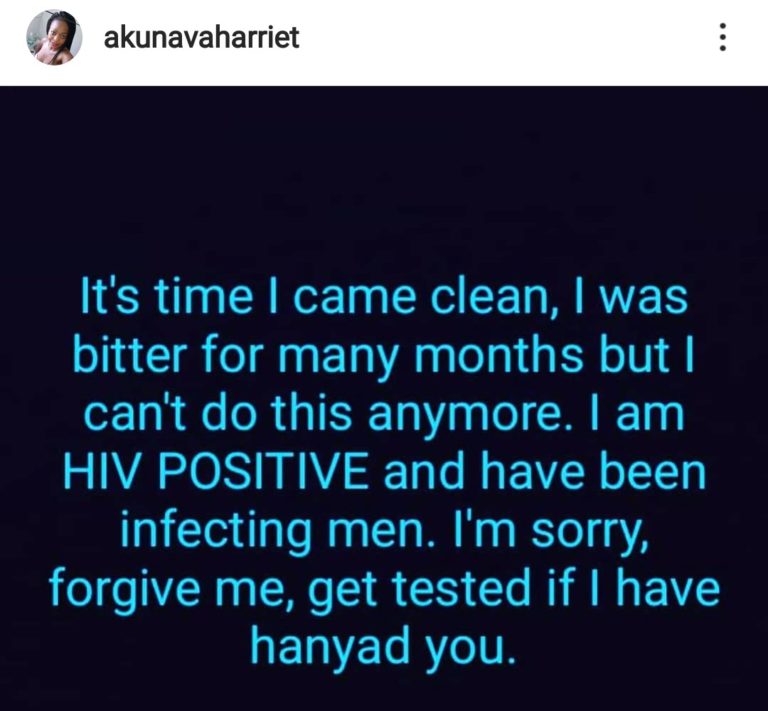 “it’s time I came clean. I was bitter for many months but I can’t do this anymore. I am HIV POSITIVE and have been infecting men. I’m sorry. Forgive me. Get tested if I have hanyad you”, she wrote.
