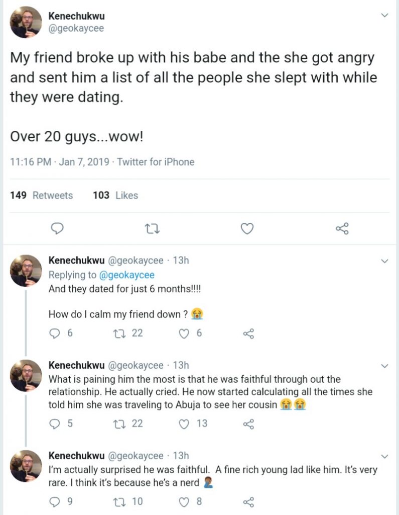 Nigerian man broke up with his girlfriend, the lady got angry and sent him list of 20 different guys she is dating after splitting with boyfriend of 6 months.