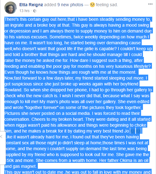 An aggrieved lady and Facebook user, Etta Reignz, took to the platform to disclose that she’s contemplating suicide after her boyfriend, David Daniels who she sends money to, cheated on her with her best friend.