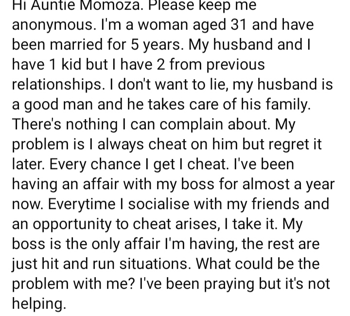 “Please keep me anonymous. I’m a woman aged 31 and have been married for 5 years. My husband and I have 1 kid but I have 2 from previous relationships. I don’t want to lie, my husband is a good man and he takes care of his family. There’s nothing I can complain about. My problem is I always cheat on him but regret it later. Every chance I get I cheat. I’ve been having an affair with my boss for almost a year now. Everytime I socialise with my friends and an opportunity to cheat arises, I take it. My boss is the only affair I’m having, the rest are just hit and run situations. What could be the problem with me? I’ve been praying but it’s not helping.”