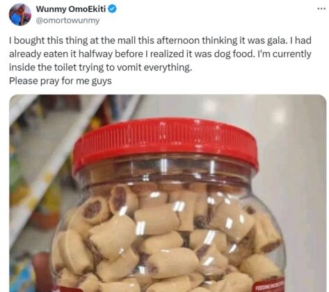 A lady who identifies as @omortowunmy has cried out via social media after she consumed a dog food she mistook for an edible snack.