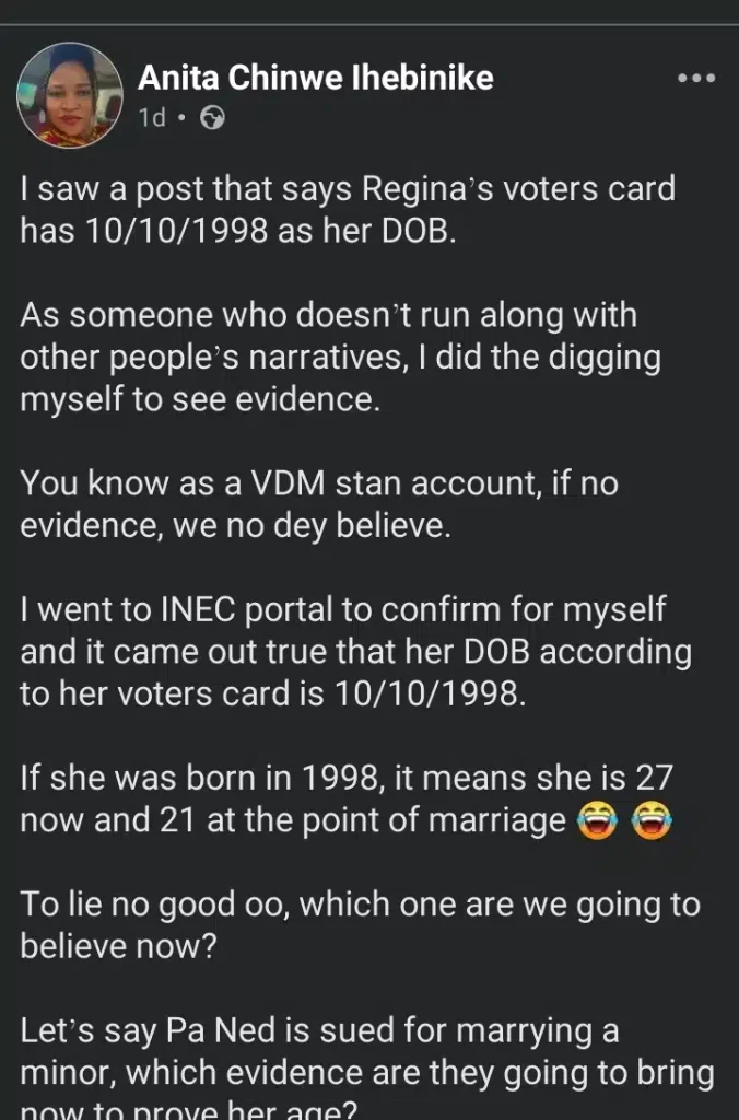 In her now-viral Facebook post, Anita Chinwe Ihebinikeon shared that she discovered Regina Daniels’ age through the Independent National Electoral Commission (INEC) portal.