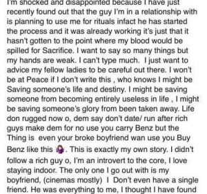 A lady has narrated how her man of 3 years was in the process of using her for ritual purposes.