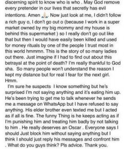 The lady who did not believe tasked her sister to make an inquiry on her behalf from her church; lo and behold, the sister returned with the same message on how the guy has plans in motion to use her for money ritual.