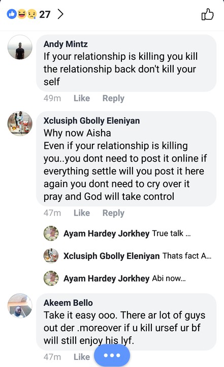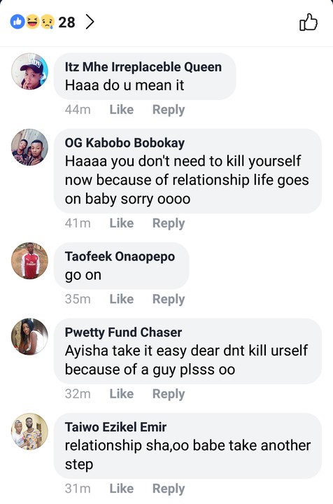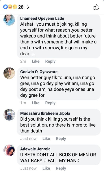 if out of everytin in dat ur brain killin urself is the option u choose no wahala….but rememba afta u die nothin will change the world go still move on. jst try and see….judgement of God dey wait and devil will be happi 2 see & welcome u nonse in bracket. instead of u 2 use ur time and do sometin meaniful u are busy cryin tellin people u want 2 kill urself, if i catch u i go make sure say i use army koboko flog stupidity comot 4 dat ur fish
