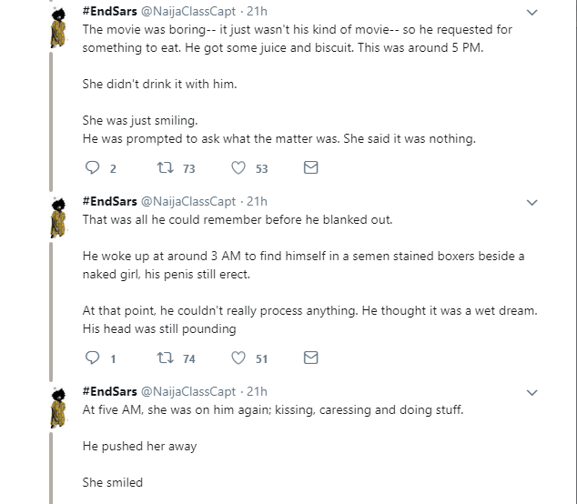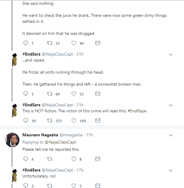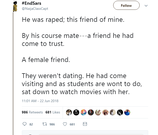 Yea, You heard that Right, The tables turned around a man is now been raped by a Lady, Twitter user just revealed the chilling story of her friend who got raped by his other female friend after he paid her visit, It was started after He got a drink from the house, and never knew its was drugged, The next thing he saw himself was stack Unclad at about 3am with his Manhood fully erect… Chai..