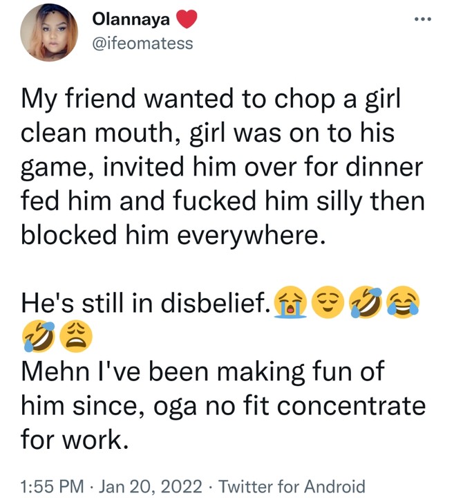 My friend wanted to chop a girl clean mouth, girl was on to his game, invited him over for dinner fed him and bleeped him silly then blocked him everywhere.