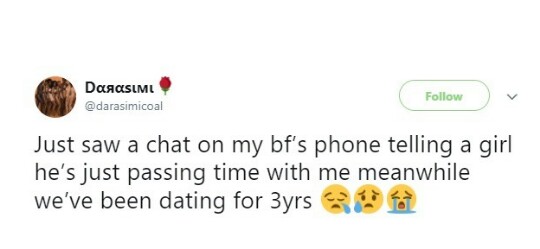 “Just saw a chat on my bf’s phone telling a girl he’s just passing time with me meanwhile we’ve been dating for 3yrs ���”