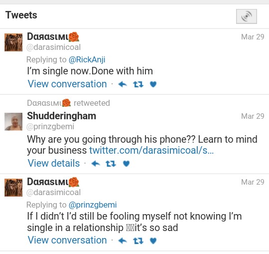 Nigerian twitter user @darasimicoal has narrated how she found out her boyfriend whom she has been dating for 3years told another lady that he is just passing time with her.