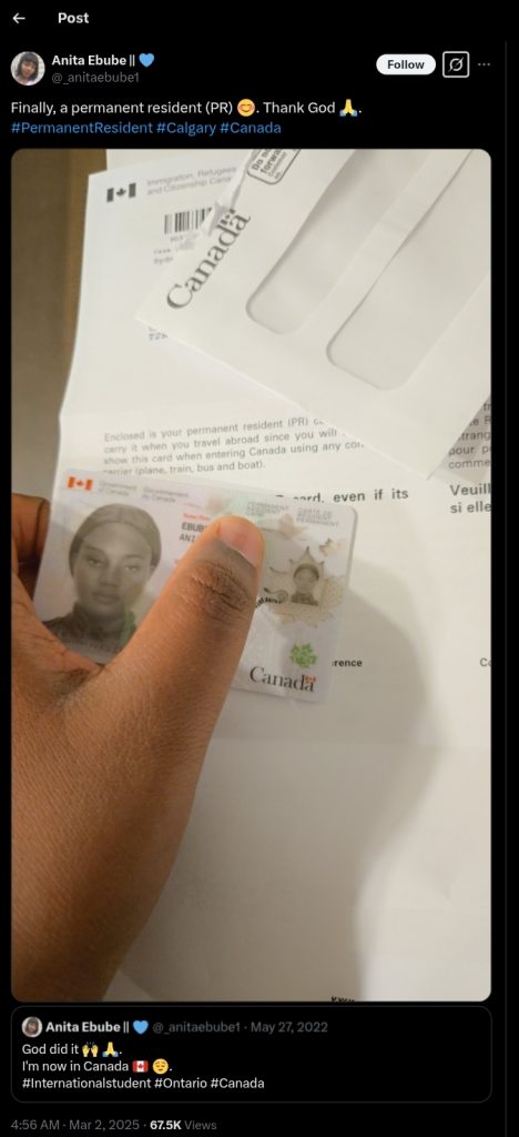 She accompanied the update by quoting a statement she made back in 2022 when she first arrived in Canada as an international student: “God did it. I’m now in Canada.”