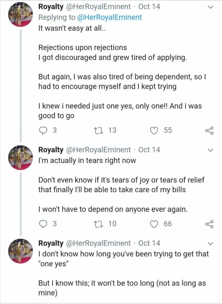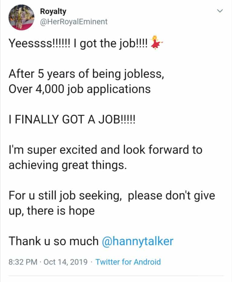 A young lady identified as Royalty has taken to Twitter to celebrate getting a job after five years of submitting applications in different offices.