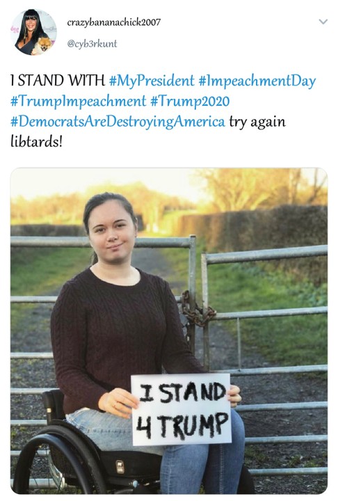 A physically challenged lady on Twitter took to the popular micro-blogging platform to share a picture of herself hold a card which says “I stand for Trump” and the reply she got from a non fan of Donald Trump has sparked outrage.