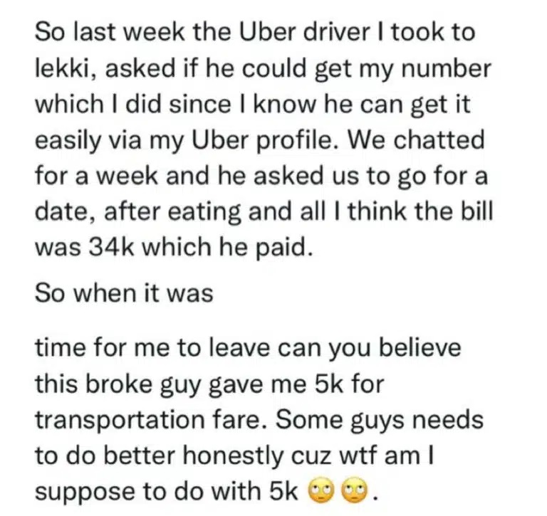 A Nigerian lady has expressed disappointment after the Uber driver she went on a date with gave her N5,000 for transport fare.
